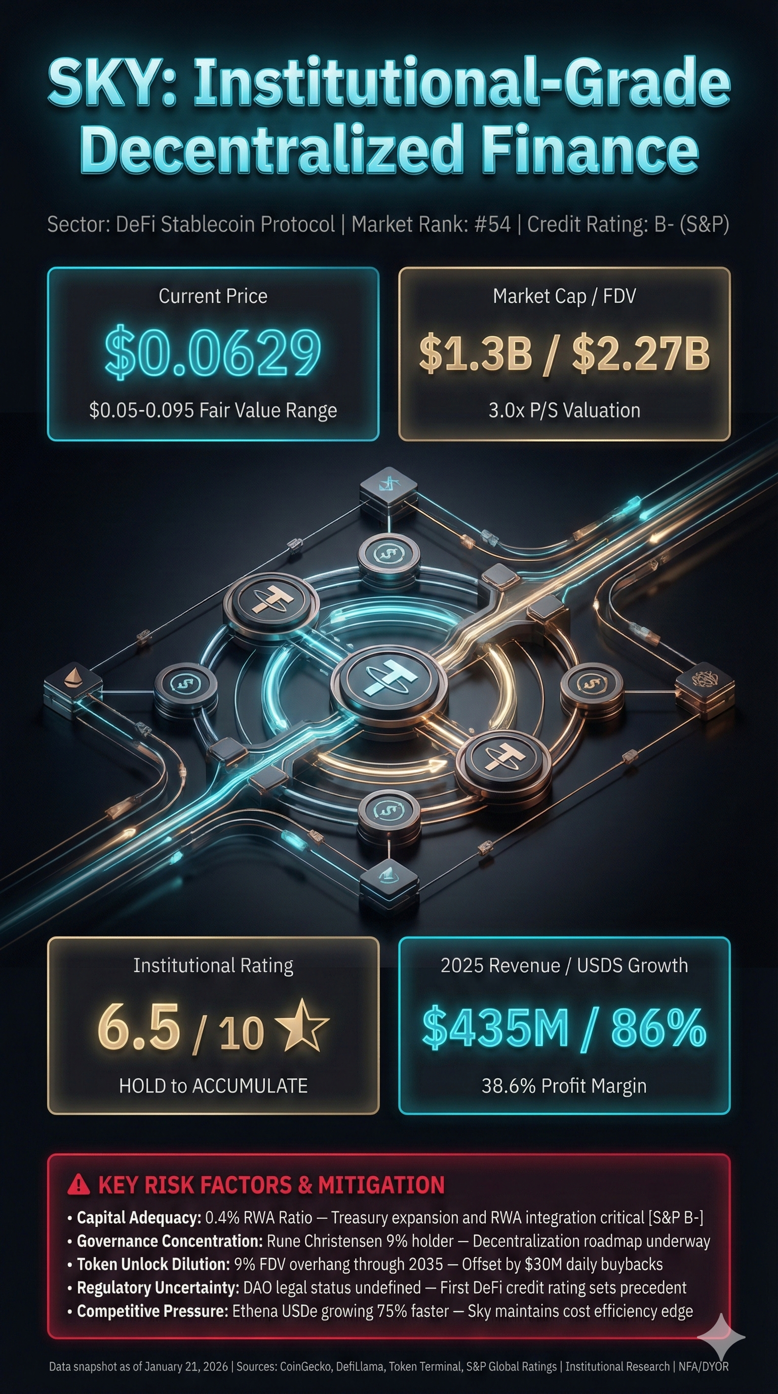 当前价格 $0.0629 处于基准到保守之间的过渡。从绝对估值角度,SKY 不便宜但也非过度。主要支撑在于:(a) 38.6% 的行业领先利润率;(b) $92.2M 2025 年回购承诺;© USDS $9.86B 规模提供的市场领导权。