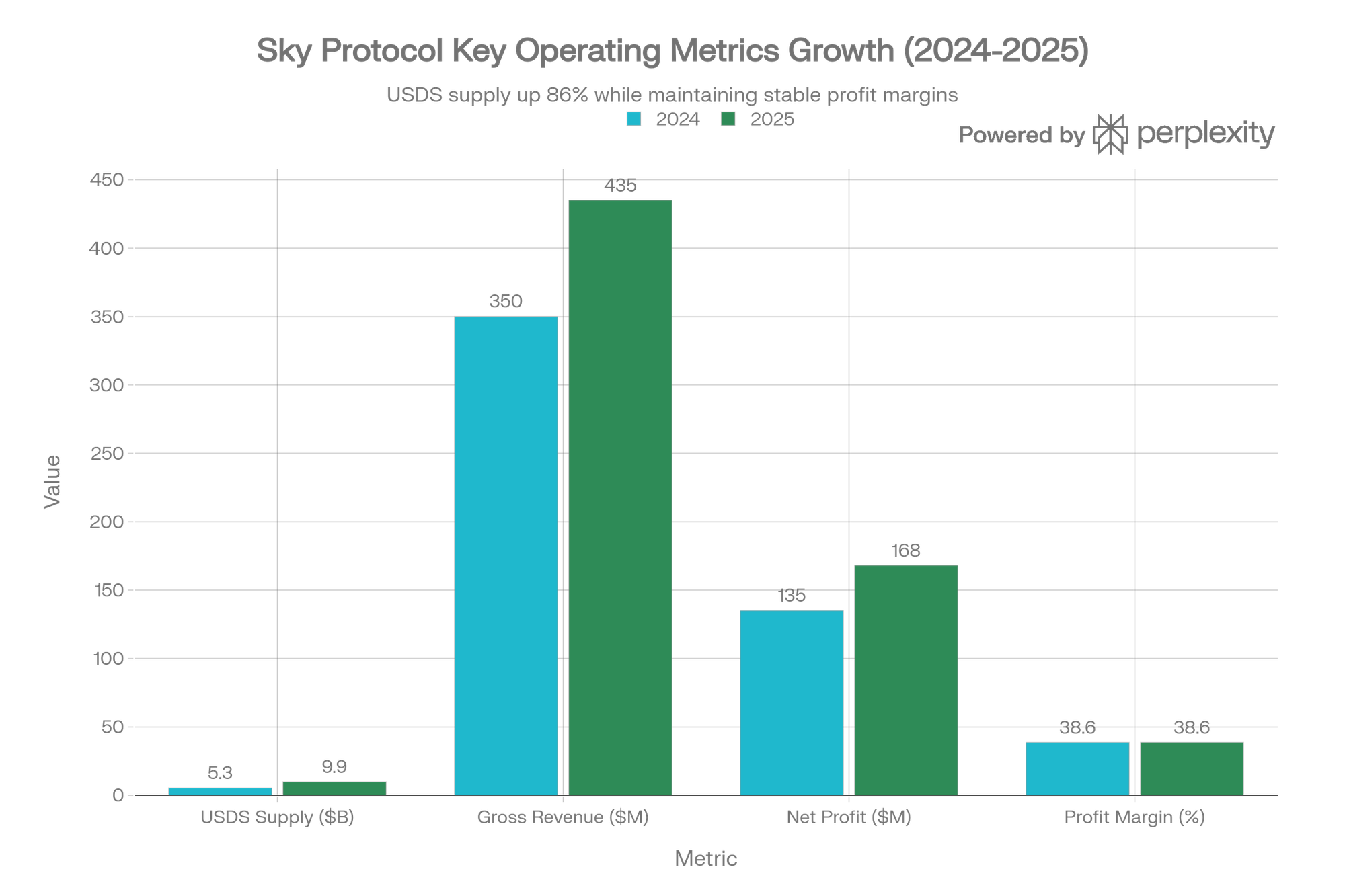 协议的财务表现超越行业基准。2025 年,Sky 生成了**$435M 年化总收入和$168M 年化净利润**,利润率稳定在 38.6%,显著高于典型 DeFi 协议的可持续性。日均收入达 $51.7万,月累计 $992万。这种稳定的现金流来自 PSM(Peg Stability Module)费用和流动性挖矿激励的真实经济学,而非虚拟代币激励。[4][8][^3]