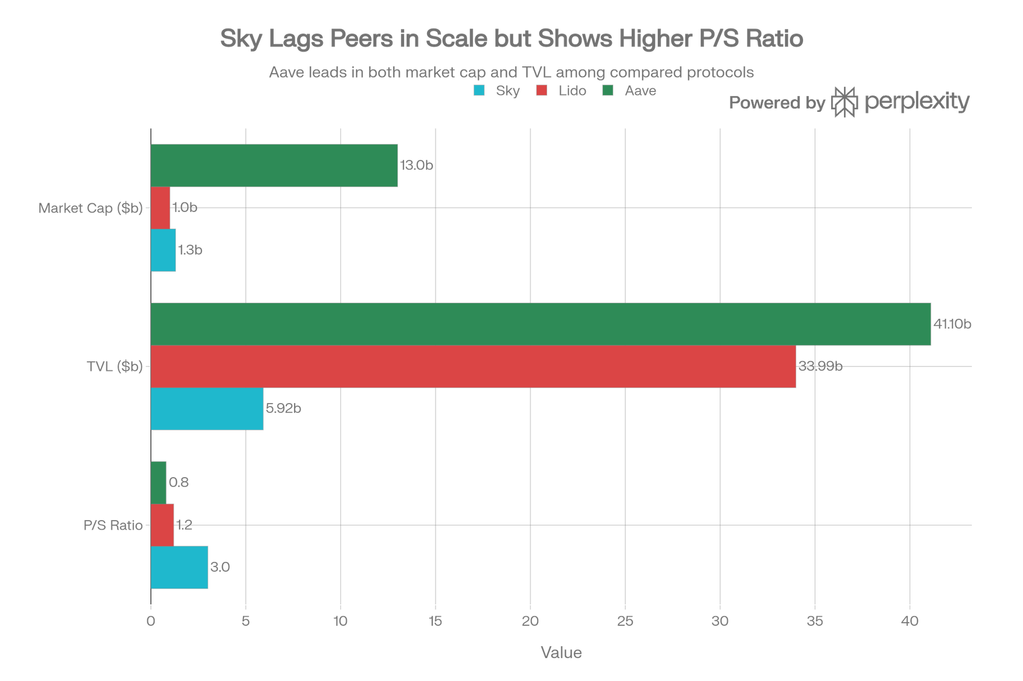 关键观察: Sky 的 P/S 倍数 (3.0-4.7x) 与 Aave 相当,后者是 DeFi 借贷的市场领导者。这看似合理,因为两者都是基础设施协议。然而,Aave 的市值 ($13B) 远超 Sky ($1.3-2.05B),市场似乎在对 DeFi 借贷(成熟、机构采用广泛)和稳定币基础设施(快速增长、但风险较高)的差异定价。