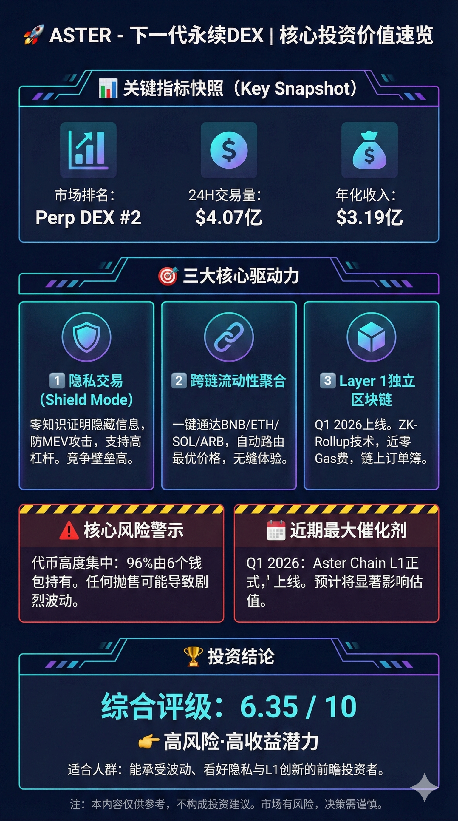 Aster 是一个去中心化永续合约交易所,2025年9月TGE后迅速成为市场焦点,凭借创新的隐私交易、跨链流动性和高杠杆产品,快速占据Perp DEX市场20-27.7%的份额。然而,项目面临严重的代币集中风险(96%供应由6个钱包控制)、交易量真实性争议、以及监管不确定性。本评估从商业模式、财务基本面、技术优势和风险因素三个维度判定其投资价值。