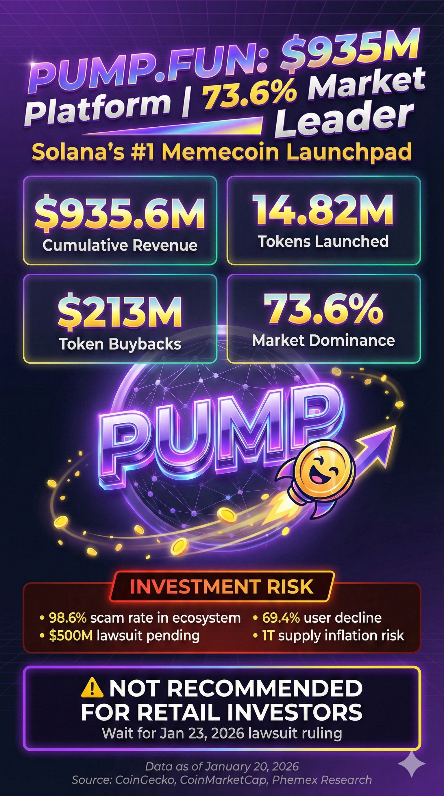 Pump.fun是Solana上领先的memecoin启动平台,自2024年1月推出以来累计创造9.36亿美元的协议收入。其原生代币PUMP于2025年7月推出,当前市场帽约9.13亿美元。尽管该平台拥有显著的市场主导地位(73.6%的市场份额),但投资PUMP代币存在严重的法律、商业和代币经济学风险,使其成为高风险、高波动性的资产。